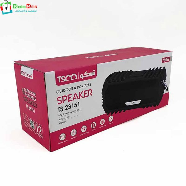 از لحاظ مشخصات فنی این اسپیکر دررده میان رده قرار گرفته که کیفیت معقولی دارد.توان اسمی این اسپیکر 700Wمیباشد که با این ابعاد کوچک فوق العاده میباشد. ظرفیت باتری این اسپیکر تسکو  1500mah میباشد که برای استفاده طولانی مدت از این  اسپیکر به مشکل مواجه نخواهید شد. همچنین استند بای تایم در اسپیکر TS23151 به 120 ساعت میرسد.مدت زمان پخش موسیقی 3تا4ساعت میرساند.توان واقعی این اسپیکر 2*5wمیباشد که قدرت صدای قابل توجهی را در اختیار شما میگذارد.نسبت سیگنال به نویز این اسپیکر 80 دسی بل میباشد.همچنین 0تا 100 شدن شارژ باتری به 5ساعت میرسد.شیار کارت حافظه نیز برای این بلندگو قابل حمل تسکو در نظر گرفته شده است.همچنین شما میتوانید با این اسپیکر به رادیو گوش کنید.