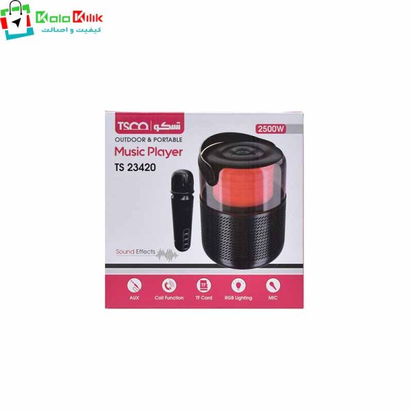 اسپیکر بلوتوثی تسکو مدل TS 23420 یکی از اسپیکر هایی است که تسکو در زمینه طراحی سنگ تمام گذاشته چرا که ازلحاظ ظاهری بسیار جذاب و منحصر به فرد است . نور RGB به کار رفته در وسط اسپیکر جلوه زیبایی به این اسپیکر پورتابل داده است .همراه اسپیکر میکروفونی تعبیه شده که در جشن ها ومهمونی ها و مراسم ها میتوانید از ان استفاده کنید.همچنین این اسپیکر دارای قابلیت کارائوکه میباشد که میتوانید با استفاده از میکروفون میتوانید با اهنگ ها همخوانی کنید ودر کنارد دوستان و اشنایان خود لحظات به یاد ماندنی ثبت کنید. از لحاظ شکل طراحی این اسپیکر به شکل استوانه ای شکل میباشد. ابعاد اسپیکر بلوتوثی تسکو۱۱۳x۱۱۳x۱۸۹ میلیمتر میلیمترمیباشد. از لحاظ وزن نیز این اسپیکر ایده ال میباشد.وزن این اسپیکر 221گرم میباشد.در بالای این اسپیکر 4دکمه تعبیه شده اعم از کم زیاد کردن صدا دکمه خاموش و روشن کردن و دکمه ی دیگر برای خاموش و روشن کردن نور RGBبه کار رفته در این اسپیکر است.